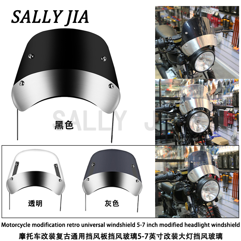 产品名称:摩托车改装复古通用挡风板挡风玻璃5-7英寸改装大灯挡风玻璃